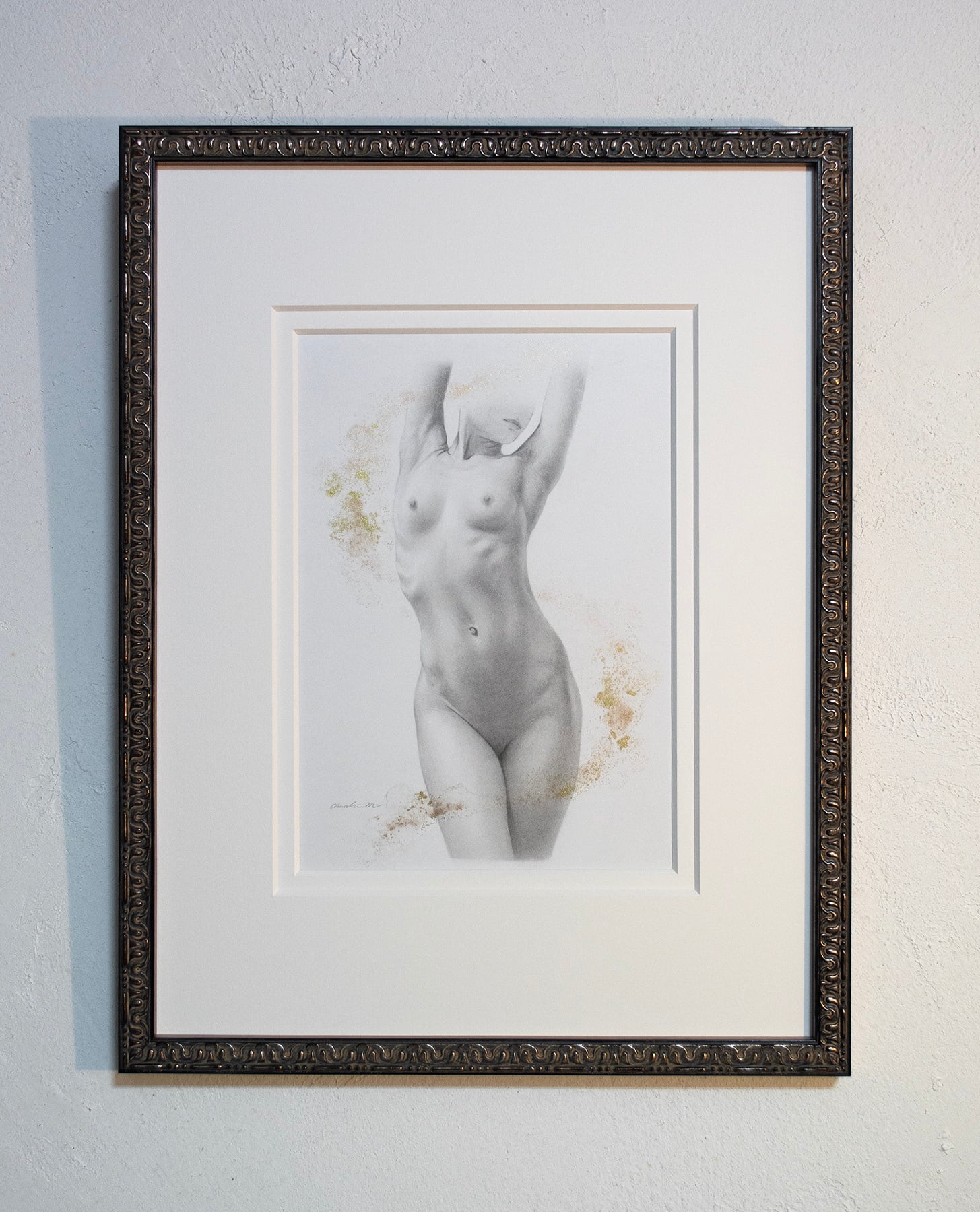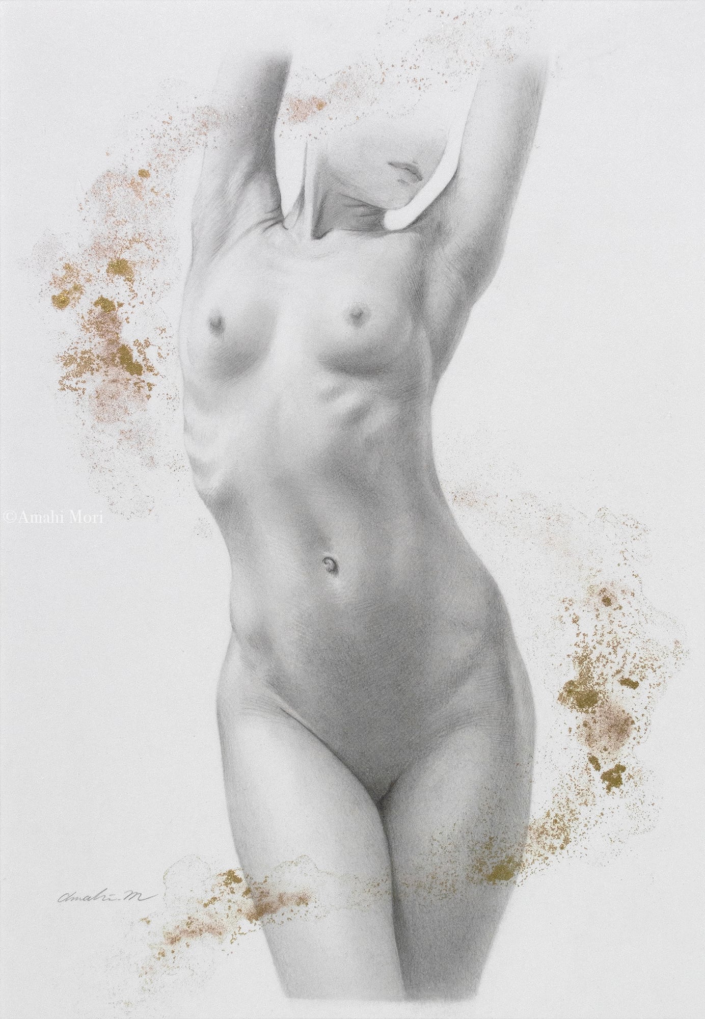 鉛筆の描画に加えゴールド顔料で部分着彩しています。